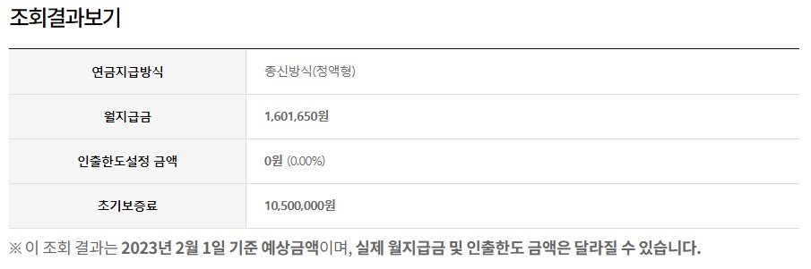 7억원의 주택을 소유하고 있는 1960년생 부부가 정액형 종신지급 방식으로 조회 한 경우의 예시입니다. 월 1,601,650원의 수령이 가능합니다. 수령액은 아래의 한국주택금융공사 홈페이지에서 예상연금 조회가 가능합니다.